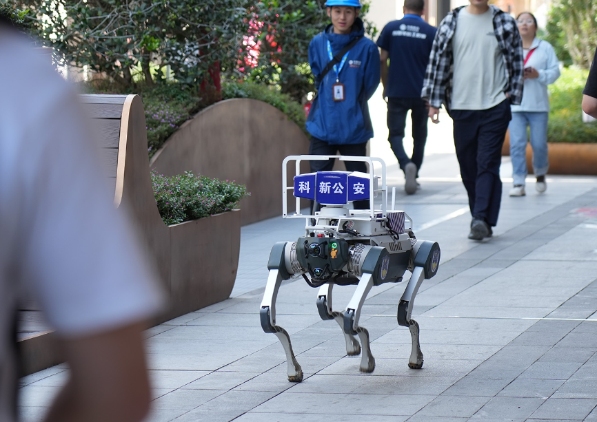 图一:巡逻机器狗在绵阳市科技城新区上马新村开展巡逻。